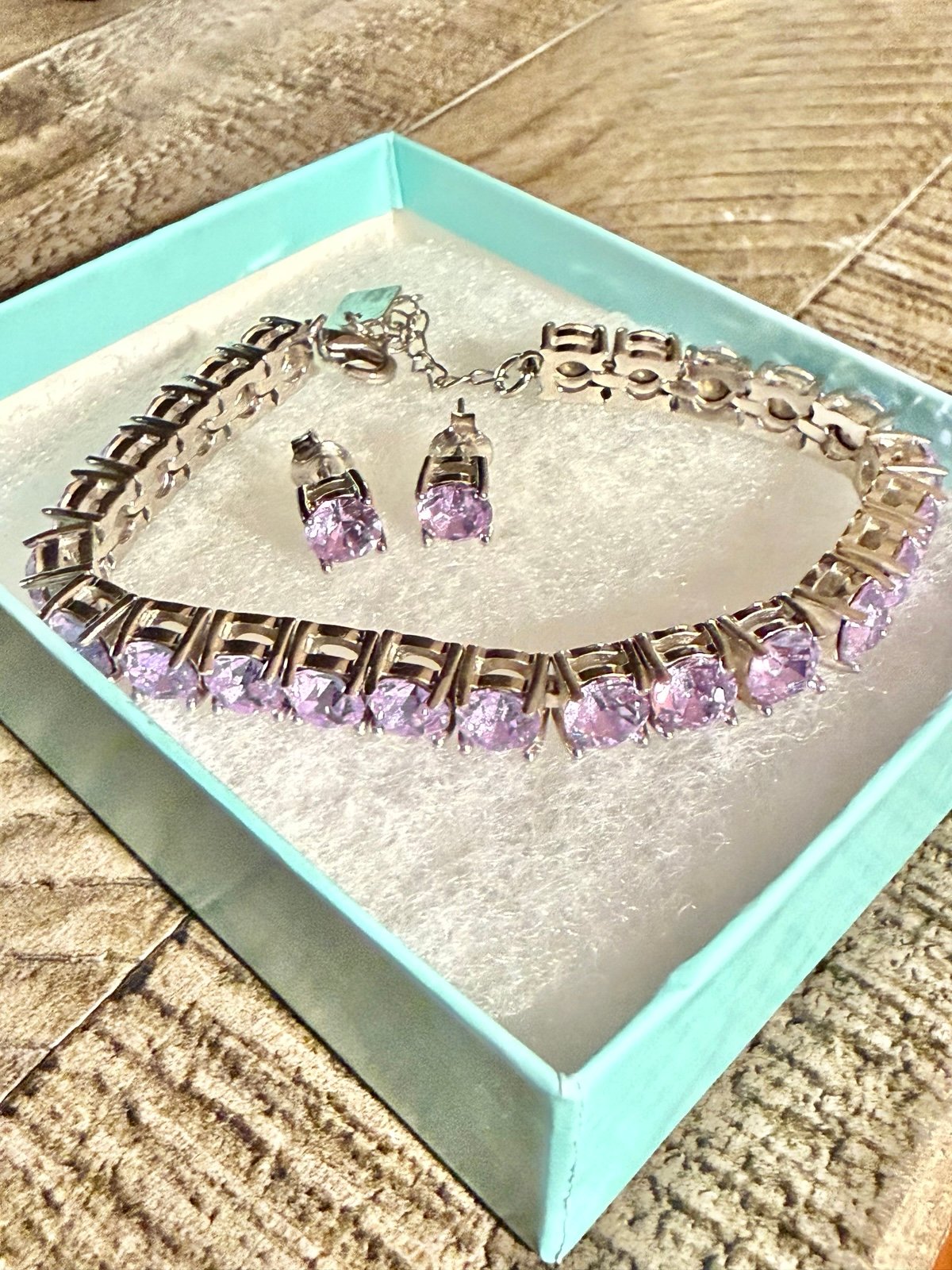 This stunning jewelry set features a beautiful combination of silver and purple tones. Perfect for adding a touch of elegance to any outfit.